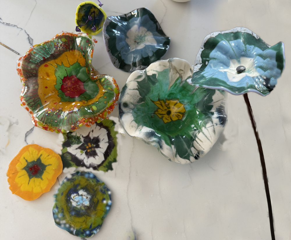 Come join us for a fun hands-on workshop where you’ll learn how to make beautiful art glass flowers or flower bowl! We’ll use glass frit  powders of many colors and water, to make your blooming creation.  This class is for beginners and experienced glass artists alike. You’ll get to make a 8-inch flower.  We’ll start by learning about frit and how to mix colors. Then, you’ll get to design your flower, choosing colors and layering techniques to make it look deep and three-dimensional. We’ll also explore different shaping and building techniques. You’ll work directly with frit slurry and glass components to create your design.